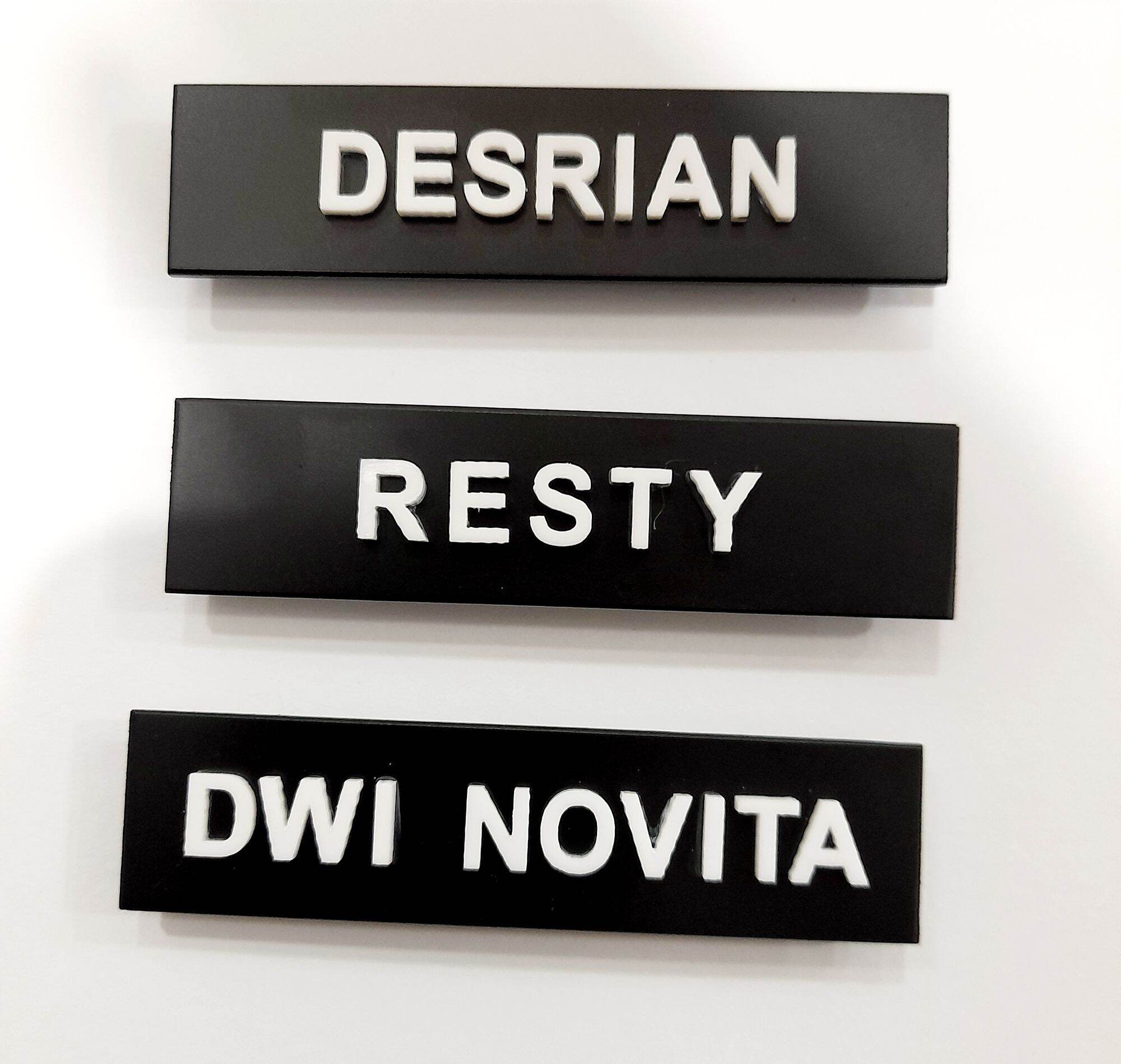 Name tag akrilik premium dengan magnet kuat yang tidak merusak pakaian. Desain full color, cetak tajam, ringan, dan nyaman digunakan. Cocok untuk karyawan, event, sekolah, hotel, dan berbagai kebutuhan identitas. Custom nama, jabatan, dan logo tersedia.